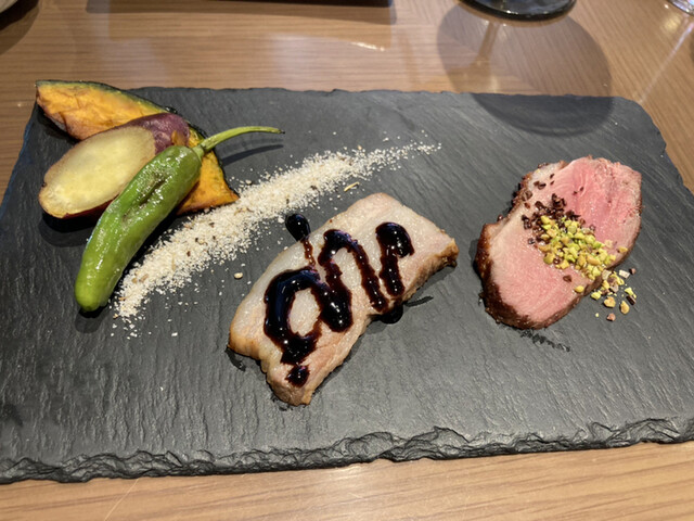 イベリコ豚と鴨の焼き物。イベリコ豚がモチモチ甘く美味しかったです。