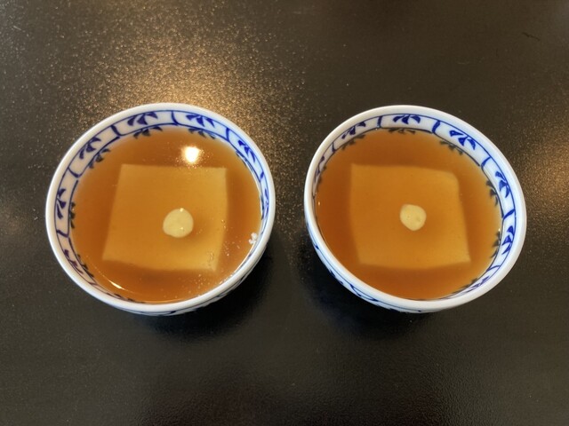 名物あんかけ豆腐.食器の裏には「笹野雪」文字入り健在.