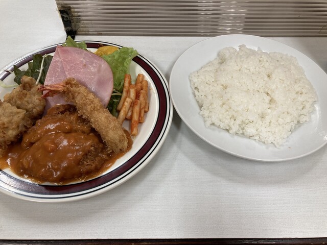 注文は『七福ランチ』。内容はエビフライ、メンチボール、肉天にハムと盛り沢山の内容である。個人的にはメンチボール好きかなあ。味は当然美味しいが、これだけ食べてビールも飲んで1,550円と大変お安く飲めてしまう。大満足なお店です(´∀`*)