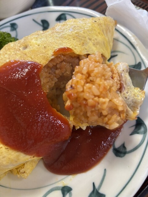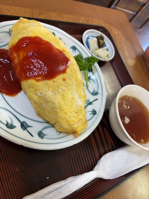 オムライスは下味がついた鶏肉が加えられたケチャップライスに経験に基づく玉子焼きを纏い、癖になる味わいである。