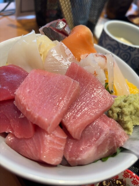 赤身、中トロ、大トロがぶつ切りにされ、混ざり合い、マグロの脂の甘さと赤味のマクロらしさを最高の具合で食べる事が出来る。