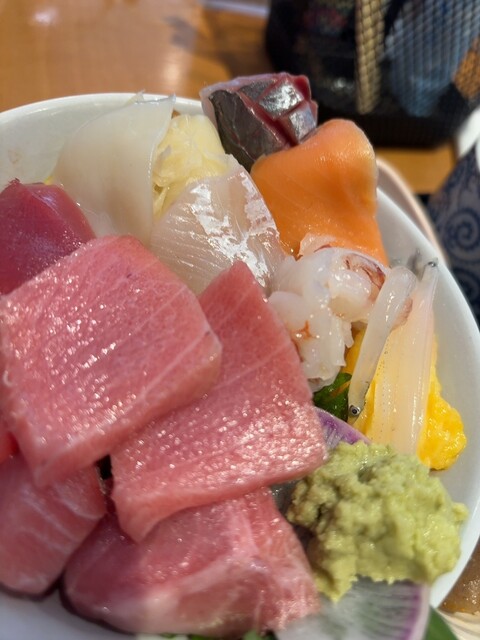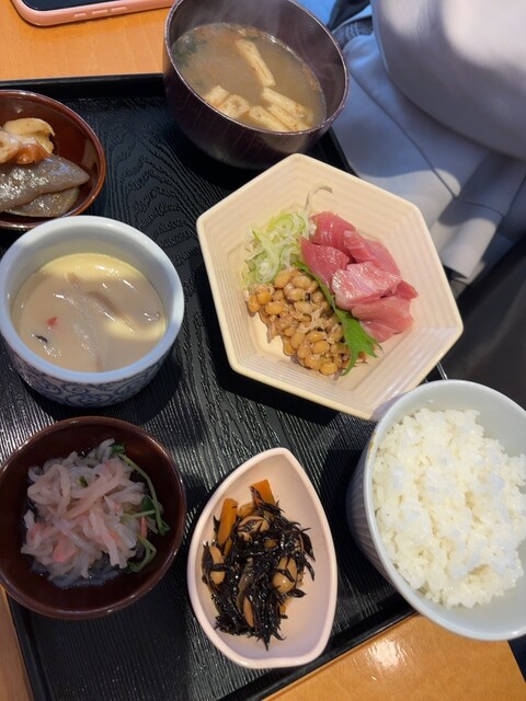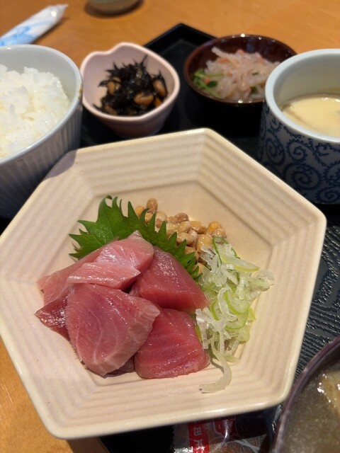 早速ミニ海鮮丼と今日のおかず、朝定期焼魚、鮪納豆定食を注文。