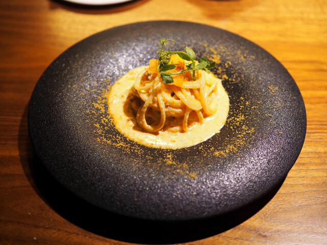 ✅振りかけられたカラスミの量のおかげか、何度口に運んでも新鮮で力強い旨みが訪れる。ウニソースには固形のままキープされたウニも存在し、香りも甘みも抜群。これほどまでに味に一体感のあるパスタには出会ったことがない。トマトと甘酒のドリンクと合わせれば、ウニクリームの味わいをもっと爽やかに、そしてよりゴージャスに感じさせてくれた。