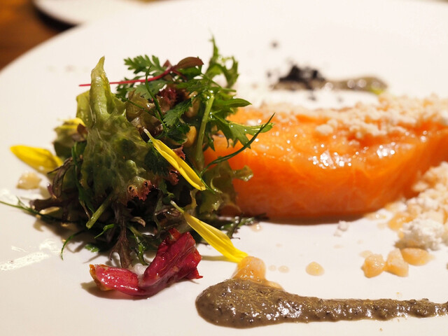✅サーモンの厚みが嬉しく、旨みもかなり分厚い。ナイフを入れた瞬間のホロホロとした身の食感に驚く。洋ナシとビーツのソースが非常に甘酸っぱく、サーモンのしっかりとした脂をマイルドにまとめてくれた。未体験の味わい。それでいて日本人の口にも合う、しっかりとした美味しさ。