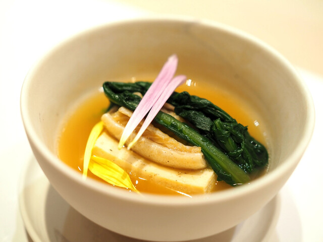 ✅春菊と鰻と木綿豆腐の一品。上品だが力強いダシとこれまた力強い鰻の旨み、特別感がモノ凄い。これほどまで鰻の美味しさを力強く感じたのは初めて。