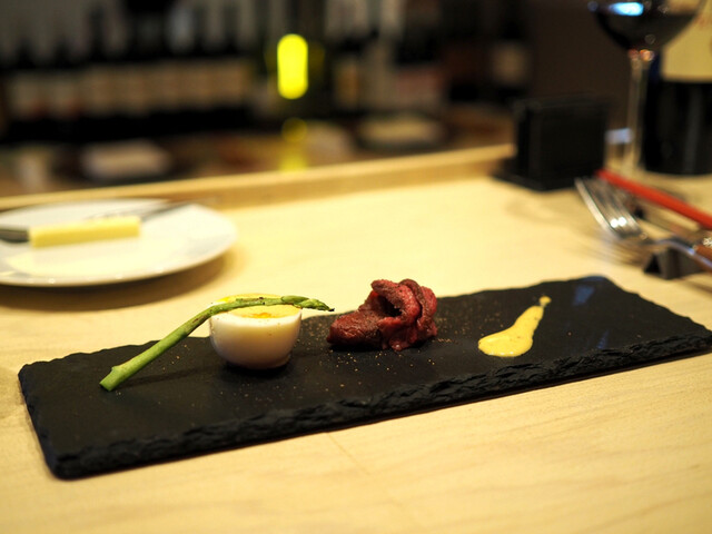 ✅半熟卵とアンチョビ入りマヨネーズのウフマヨ。シンプルさの中に爽やかさと濃厚さ。味わい深く、軽い食べ応え。
