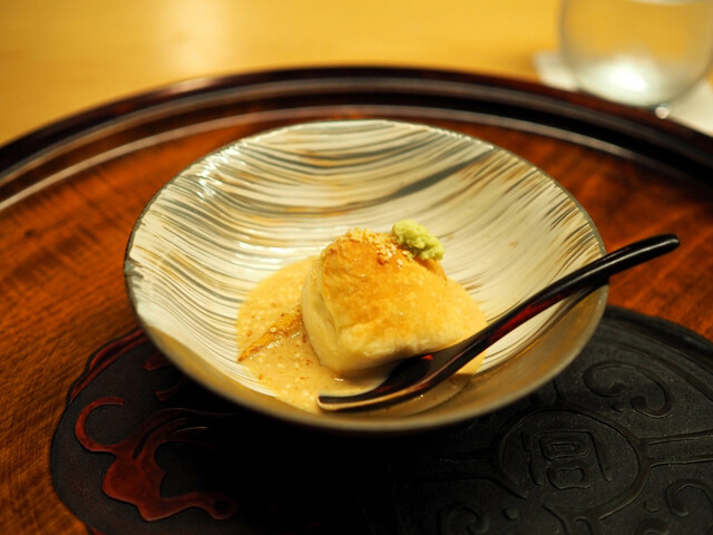 ✅ほかほかの焼いた胡麻豆腐。濃厚めなゴマだれとの相性抜群。とてつもない風味と甘さ、濃厚さが極まっている。胡麻豆腐のもっちり感も目を見張る。