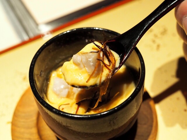 ✅香ばしさ漂う珍しい茶碗蒸し。生地の上に金目鯛と揚げた白髪ネギが乗る。生地の卵の色から違い、金目鯛が大量に入るのにも驚く。特別な味付けは無いはず、なのに金目鯛と出汁とネギのおいしさだけでここまで深みと香ばしさが出るのかといた。お肉は一旦休憩、優しい一品でお腹が休まるのも良い。銀杏やしいたけなどオーソドックスな具材も入る。
