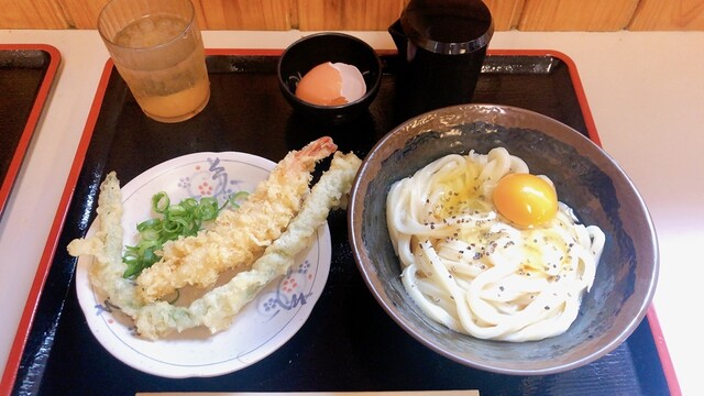 釜バターが有名だったので頼みました。カルボナーラみたいにバターと卵とコショウが美味しい!ネギとだし醤油でさらに美味しさアップ♡ただやっぱり温かいうどんだとコシが弱くなるのでそこは残念。天ぷらはけっこう普通。
