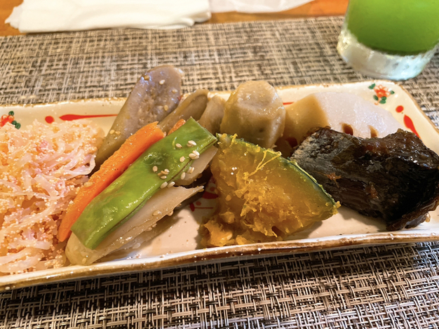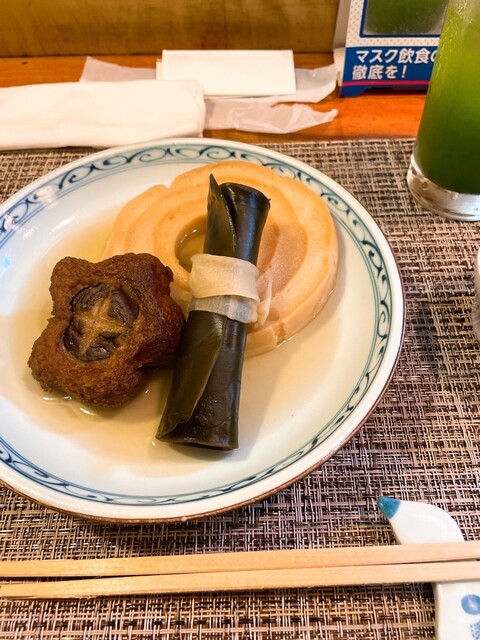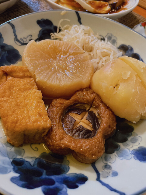 女将さんこだわりの緑茶ハイを飲みながら煮物の盛り合わせ、おでんの大根をいただきました。