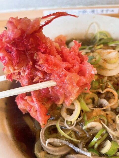 太麺そばに、紅生姜天とゲソ天をトッピング。