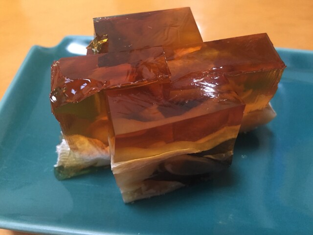 最初は、煮こごり。こちらはフグから抽出したコラーゲンを純粋に固めたものらしいです。寒天などを一切入れてないらしいので、味にとっても深みがあるものになってました。