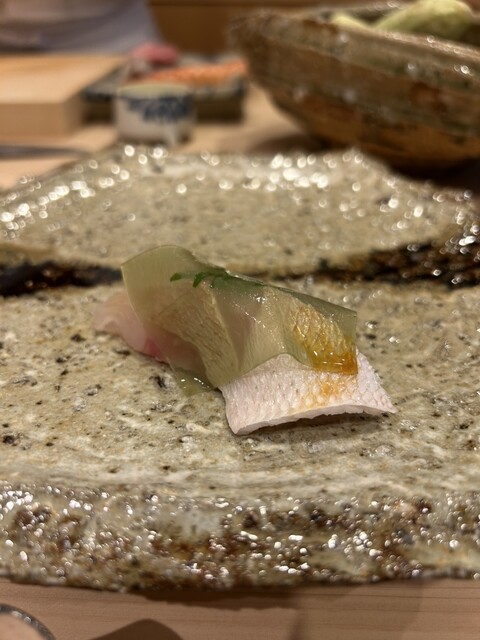乗っているのは白板昆布、間には木の芽かな。鹿児島県産。やや淡泊な身に昆布と木の芽の風味がすばらしく調和。