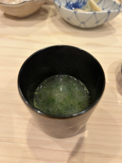 あさり出汁と生海苔お味噌汁。山椒が効いていて爽やかな辛みが決め手で最後にスッキリして美味。
