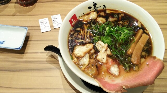 清乃ブラック¥900税込+餃子セット¥400。まず、スープを。熱っ、少し舌ヤケドした。素晴らしい。