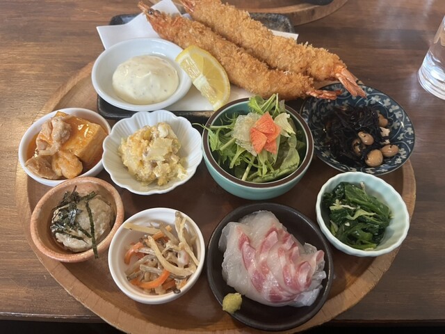 人気のプレ-トのなかから、鯛メシとエビフライセットに!みて!巨大なエビフライが2本も!