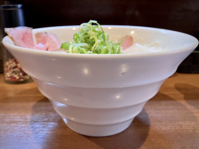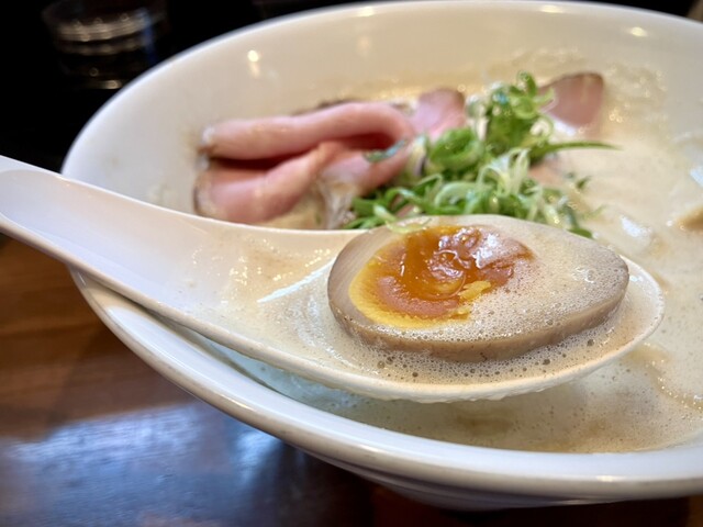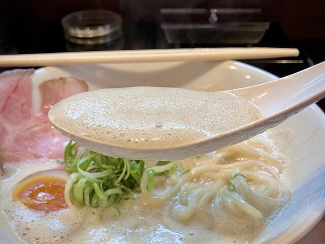 ふわふわあわあわの食感に鶏白湯のコクがあってまったりとした優しい味わい。そして、最後にゆ魚粉。