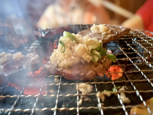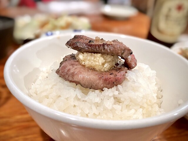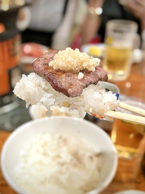 ややしっかりめに塩タンを焼いて、その上にたっぷりのニンニク薬味を乗せて、おっきいお口で、1口でいけば、口中に溢れるワイルドなうまさ!