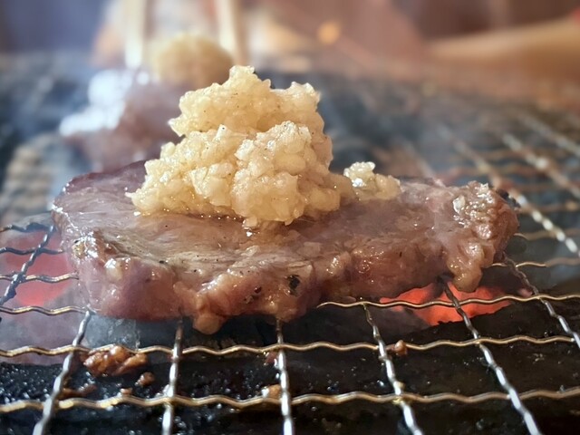 やや分厚めカットの塩タンの下には、大量のニンニク薬味!