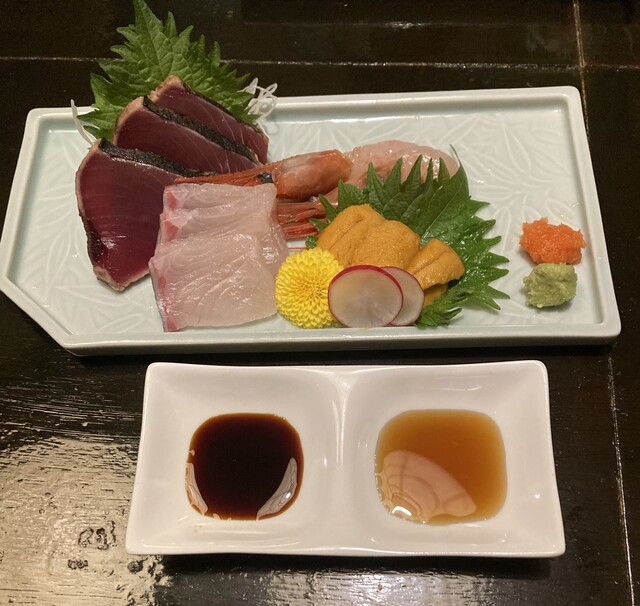 お刺身盛り合わせは、質の良いお魚達が新鮮でどれも絶品!ウニは粒が大きく味は濃厚!戻り鰹は一本釣りかな?臭みが無く、綺麗な味でした。