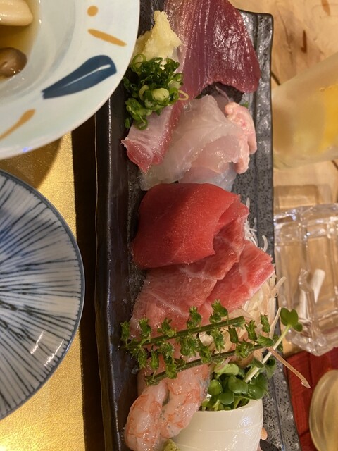 刺し盛は、ヒラメの昆布〆、中トロ、猛者海老?、