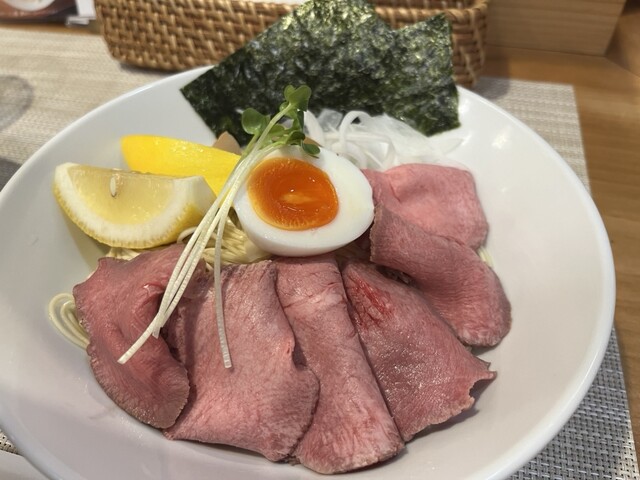 牛タン5枚にオニオンスライス、味玉、メンマ、カイワレ、海苔、黄色いウリ