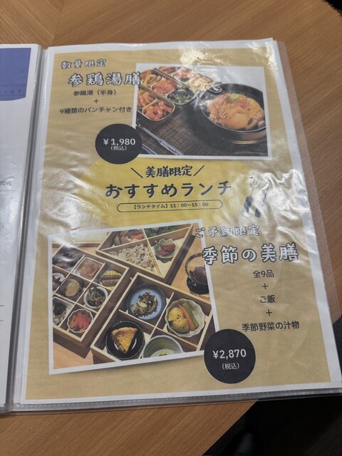 今回いただいたのは、お店の看板メニューでもある「参鶏湯(サムゲタン)膳」です。運ばれてきてまず驚くのは、その彩りの豊かさ。メインの参鶏湯の周りには、旬の野菜をふんだんに使った韓国風のお惣菜(パンチャン)や創作小鉢がずらりと並びます。レンコン饅頭や大根のなますなど、どれも素材の味を活かした繊細な味付けで、「次はどれを食べようか」と迷う時間さえ幸せに感じられました。