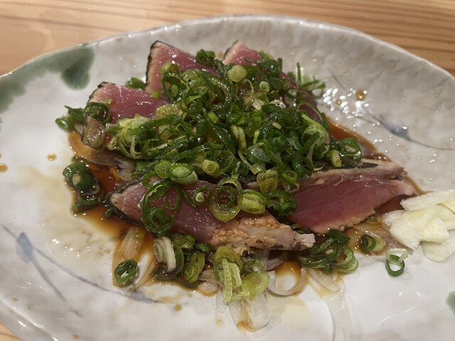 付き出しの寿司でお腹の昂ぶりを抑え、鰹タタキへ。