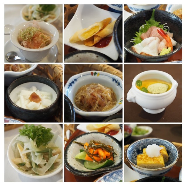 籠の中に、たくさんの品数。見た目も味のバランスもとれていてキレイでおいしいです。梅あんのかかった茶碗蒸しと和風のサラダも。
