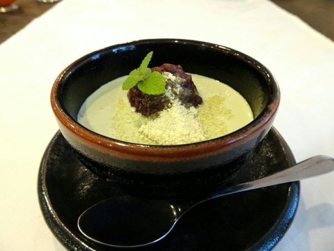 このデザートも手作り。ギュウヒで白玉とずんだあんを巻いた和菓子にアイスクリーム。