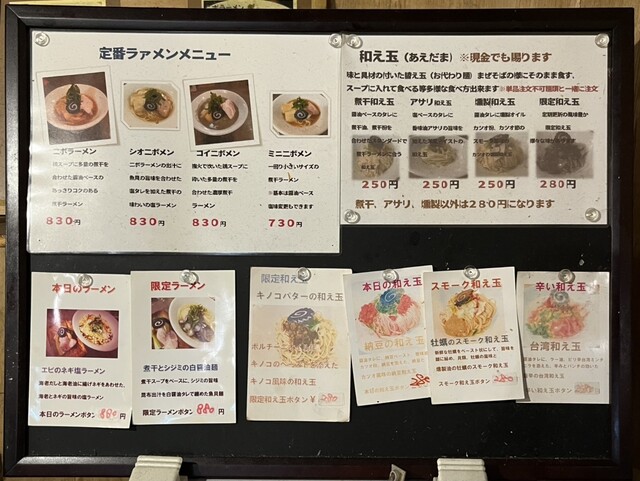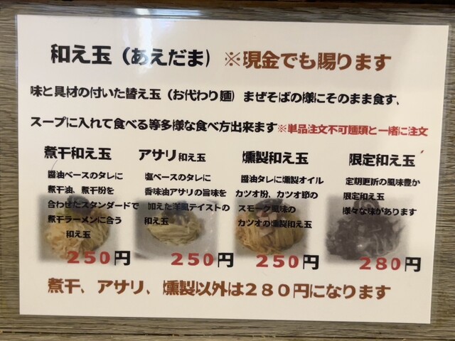 煮干し出汁のラーメンがメインですが、和え玉や限定麺も充実してます