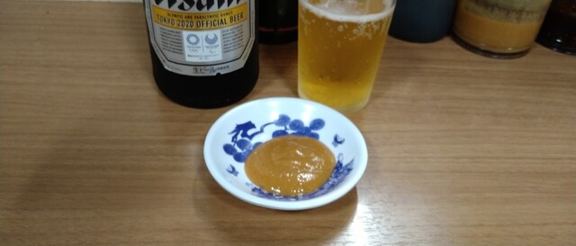 焼けあがり待つ間に、いつもの味噌ダレと麦酒でいっぱい