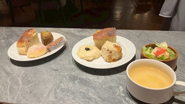 焼きたてのフォッカッチャが食べ放題。その他、甘い系のパン5種が食べ放題。