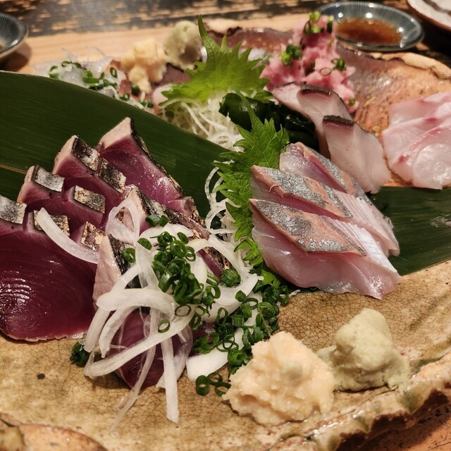 そして、お刺身の盛り合わせ。新鮮で色とりどりのお刺身が、これでもかとばかりに盛られています。特に印象的だったのは、手前のカツオのたたき。表面は香ばしく炙られ、中はしっとりとした食感。口に入れた瞬間の 풍미がたまりません。