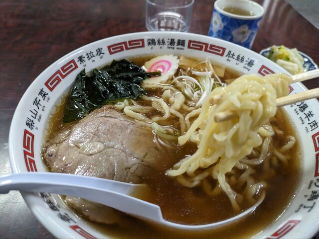 麺は「中太やや低かん水やや縮れ手打ち麺」です。藤岡の「み○ご食堂」さんと、太田の「森○屋支店太田店」さんの中間のような麺で、わたしはこの麺が大好きなんです。