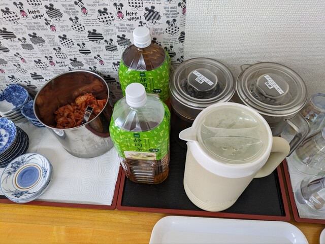 アイス・コーヒー(無糖・加糖)、緑茶、お冷、氷、そして白菜の朝鮮漬(キムチ)。