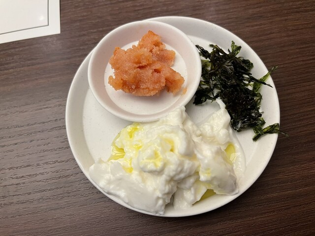 本日のアテ(明太子・モッツァレラ・海苔) 二人でつまむのにちょうど良い酒泥棒なプレート。 博多名物の明太子は粒立ちが良く、ピリッとした辛味がたまりません。 そして真打ちは「モッツァレラチーズのオリーブオイルがけ」。これに添えられた海苔をまぶして食べると、ミルキーなコクと磯の風味が融合し、猛烈にお酒を呼びます。これは家でも真似したくなる反則級の旨さ。