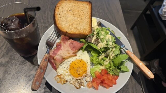 クロックムッシュと、コーヒーシナモンロールと、アイスカフェラテ。