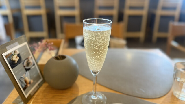 ブドウジュースは普通の味だけど、フルートグラスに入れてくれるのが嬉しい。