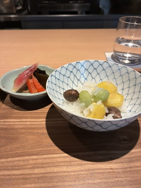 締めの土鍋ご飯は栗やむかご、銀杏の香り豊かで、季節を閉じ込めたよう。九条ネギと茗荷のまぜご飯、伊勢えび雑炊まで贅沢な三段構え。デザートのわらび餅まで完璧で、最後まで余韻が続く。