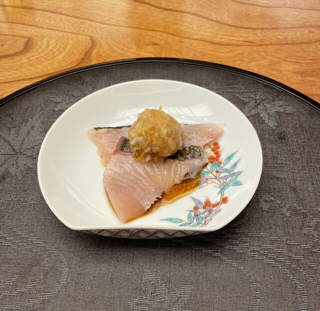 鰆の腹と背の霜焼き作り、柚子大根と自家製ポン酢で