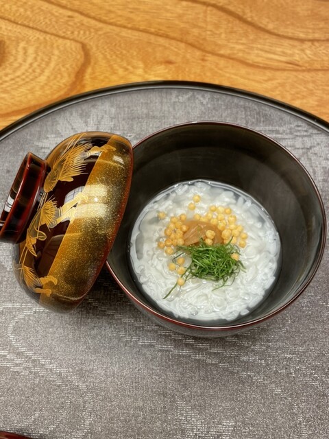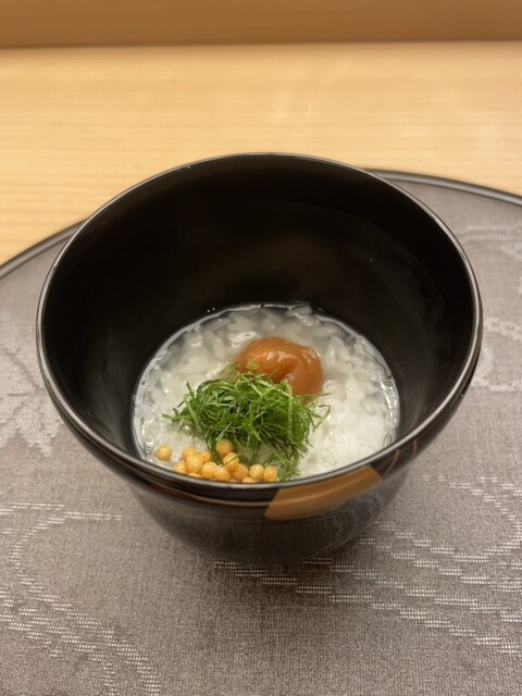 →前菜は梅のお粥からスタート、輪島塗の器に優しい酸味で穏やかな味わいのお粥が印象的です