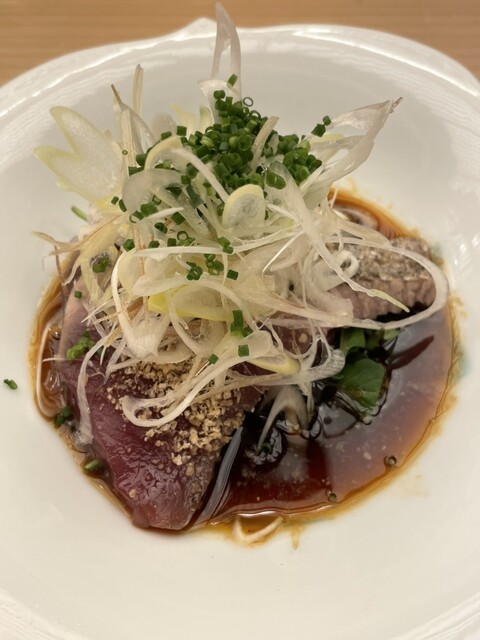背中と腹の2種類の部位を白ネギ、茗荷、ルッコラ、擦り胡麻、自家製ポン酢と一緒にいただきます