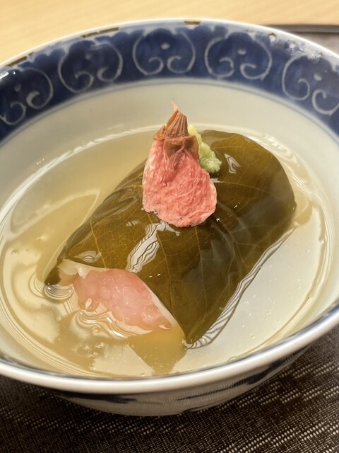 →道明寺粉を鰹出汁で戻し、鯛に桜の葉を纏わせてあります