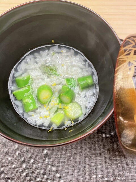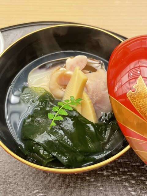 かつおの1番出汁に島根県産大はまぐり、若竹、わかめを浮かべて