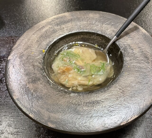 ⑦熟成した筍のペーストに子持ち鮎を乗せ、スッポンのコンソメスープを注いで