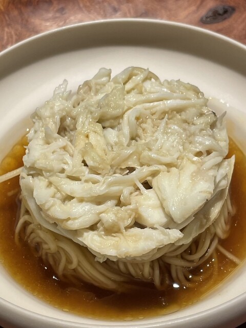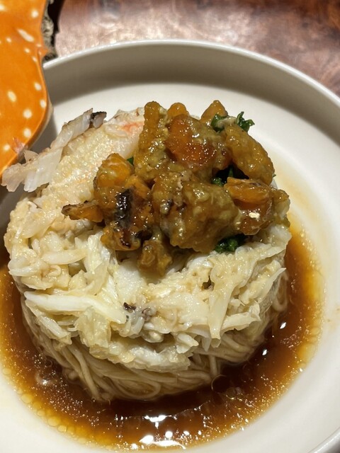 島原手延べ素麺の上にはメスの蟹、内子、アサツキ、蟹身