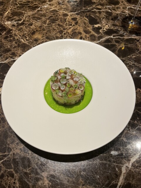 貝のサラダ、カワハギ、ユリイカ、昆布の泡、カワハギ、ユリイカ、酸味を付けた米