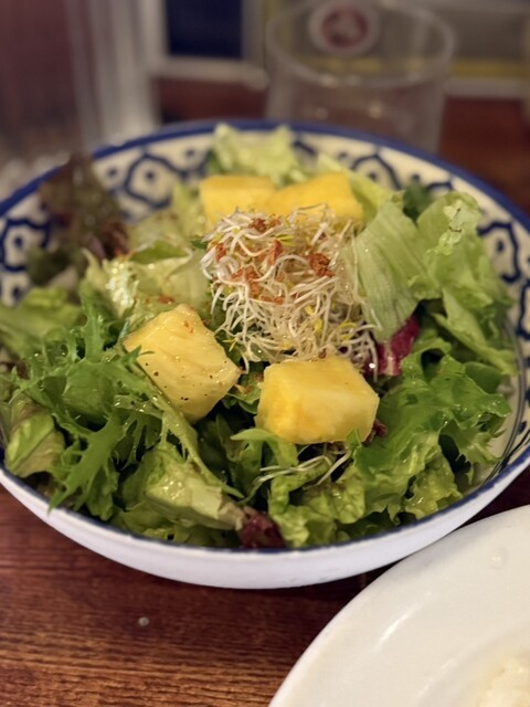 後から届いたサラダには夏季限定でパイナップルが乗っているではありませんか!(去年はスイカでした)
