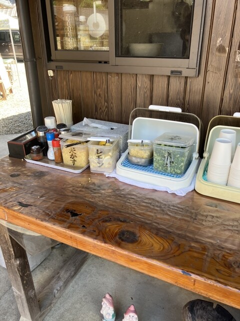 店内でも食べられますが、天気が良いので外のあづまやで。トッピングもネギ、天かすなどが自由に入れられます。
